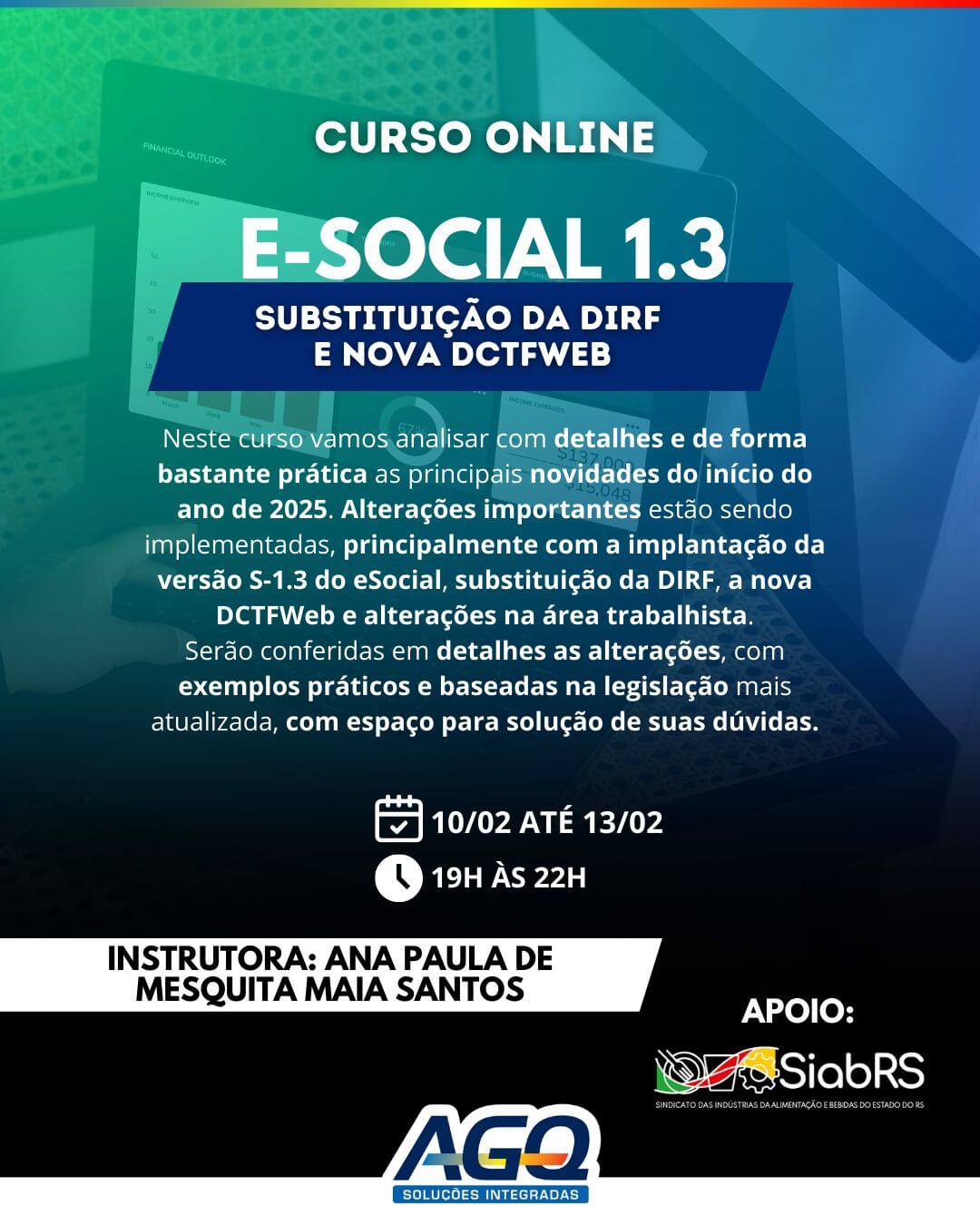 A capacitação, promovida pela AGQ-Associação Gaúcha para a Qualidade, ocorrerá entre os dias 10 e 13 de fevereiro, das 19h às 22h, e vai analisar com detalhes e de forma bastante prática as principais novidades do início do ano de 2025. Alterações importantes estão sendo implementadas, principalmente com a implantação da versão 5-1.3 do eSocial, substituição da DIRF, a nova DCTFWeb e alterações na área trabalhista.